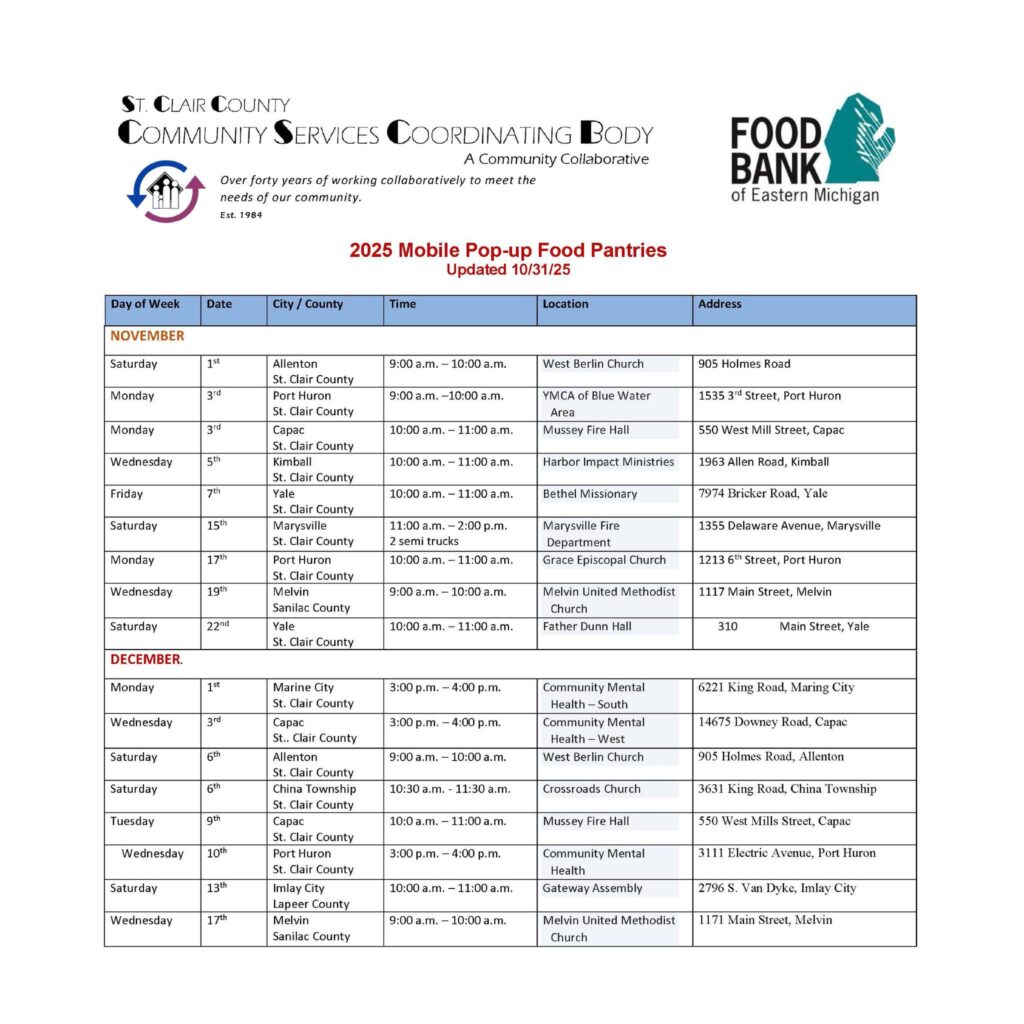 Operation Transformation, a St. Clair County outreach non-profit, keeps an updated list of Food Giveaways. It can be found here: https://www.optrans.org/fooddistribution. The St. Clair County Community Services Coordinating Body also keeps a list. Following is the list updated 10/31/25.